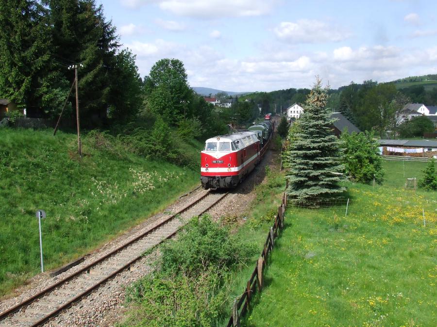 Markersbach. Die 118 770 beginnt ihren Aufstieg zum Viadukt...
