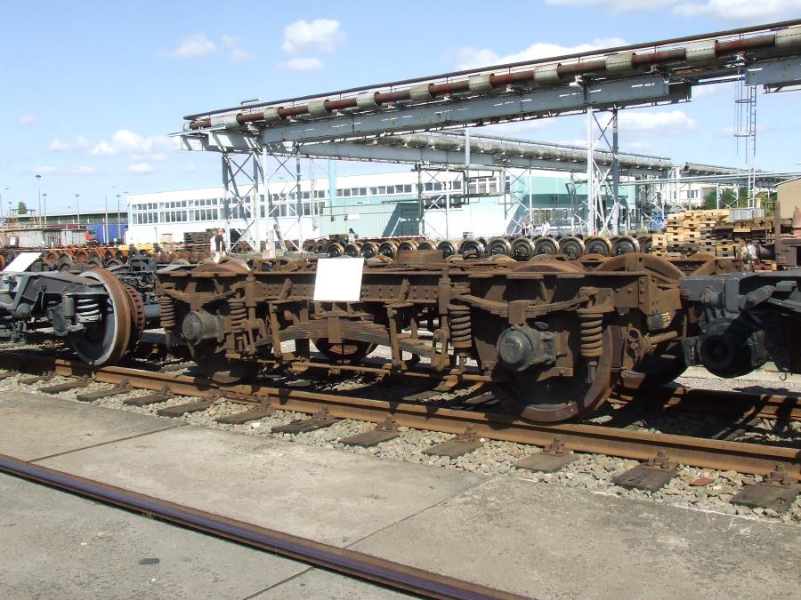 Vor der Radsatzwerkstatt gab es eine Ausstellung von Drehgestellen - interessant aufbereitet für Anfänger und Fortgeschrittene. Hier ein Drehgestell der Bauart "Görlitz-III-leicht" - bekannt von den DRG-Eilzugwagen. |