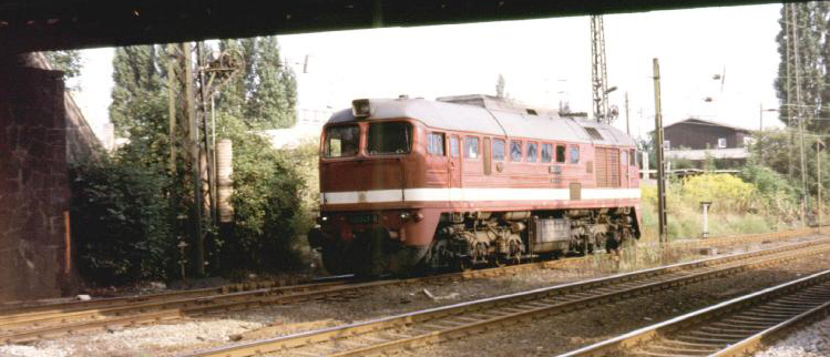 gefragt… Die M62 begann auf den Gleisen der DR ihren Dienst im schweren Güterzugdienst auf den Magistralen, nicht selten vor Durchgangsgüterzügen mit langen Laufwegen und im Kohle- und Kaliverkehr. Und sie löste Dampfloks im Güterverkehr vor grenzüberschreitenden Leistungen ab. Mit der Indienstellung von Loks der BR130, 131 und 132 verlor die 120 zunehmend die Leistungen auf den Magistralen und setzte verstärkt Dampflokomotiven der Baureihen 50 und 52 vor Güterzügen im vorwiegend regionalen Verkehr frei. Mit der fortschreitenden Streckenelektrifizierung wurde die 120 in der 2. Hälfte der 80-er Jahre bereits teilweise im planmäßigen Verkehr entbehrlich, beförderten Nahgüterzüge und erfüllte Reserveaufgaben, Bauzugdienste usw. Der Verkehrsrückgang im Zuge der politischen Wende in der DDR tat ihr Übriges… Trotz der nicht vorhandenen Heizeinrichtung für den Reisezugdienst wurde die V200 / BR120 bei der DR außerhalb der Heizperiode auch im Reisezugdienst eingesetzt, während der Heizperiode als Vorspann. Besonders häufig war Einsatz der 120 vor Reisezügen in den BW’s der Rbd Erfurt (vor allem regionaler Berufsverkehr und Ersatzleistungen für die BR119, auch planmäßiger Vorspann im grenzüberschreitenden Reiseverkehr nach Bebra) und in den Sommermonaten an der Ostseeküste zur Bewältigung des Sommerreiseverkehrs (auch im Schnellzugdienst). Letzte Planleistung vor Reisezugwagen für die 120 war 1991 das Miltärschnellzugpaar D1196/1197 auf dem Abschnitt Eberswalde - Fürstenberg/Havel. |