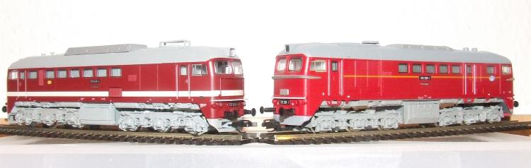 Das Roco-Modell besitzt im Gegensatz zum Tillig-Modell keine Typhone zur Abgabe von Warnsignalen auf dem Dach. Beim Nachschlagen im bereits mehrfach erwähnten EK-Buch wurde festgestellt, dass die 120-er mit dem Meininger Schalldämpfer tatsächlich keine sichtbaren Typhone auf dem Dach haben – sie befinden sich am Original nicht sichtbar unterhalb des Führerstandes. Das EK-Buch zur V200 nennt explizit keine Richtlinien und Serienänderungen für die Anordnung der Typhone in Zusammenhang mit der Schalldämpferbauart. Die Anordnung der Typhone am Tillig-Modell entspricht im Wesentlichen der Anordnung lt. Maßskizze bei der Verwendung des russischen Schalldämpfers. Damit entsprechen beide Modelle diesbezüglich ihren Vorbildern. | ||||||