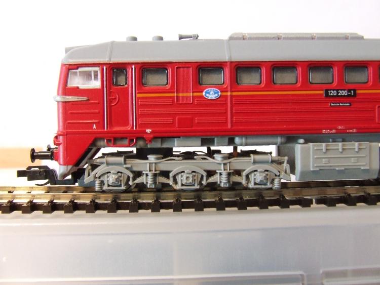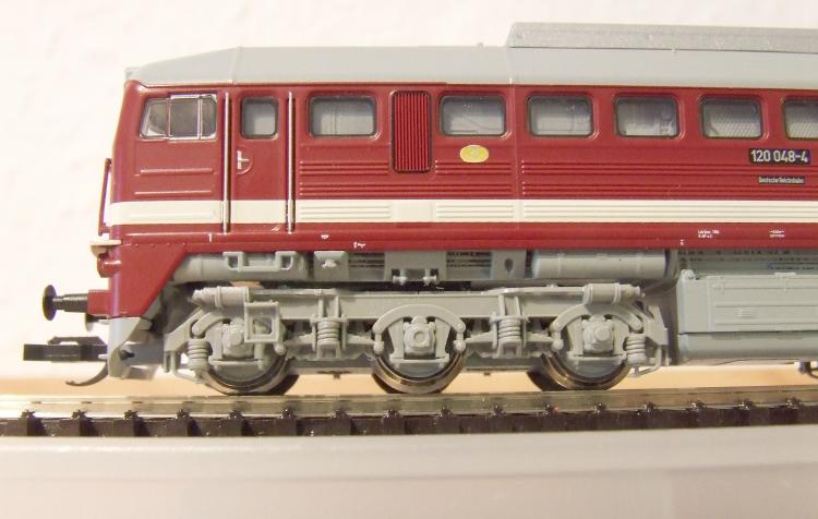 Drehgestellrahmen liegen die Modelle wohl ziemlich gleichauf. Beide Hersteller haben auf die Nachbildung der „radnahen Teile“ der Bremseinrichtung weitgehend verzichtet. Die V200 / BR120 hat eine von der bei der DR üblichen Form der Bremssohlen abweichende Ausführung, die nicht nur die Lauffläche selbst wirkt, sondern auch den Spurkranz erfasst. Eine vorbildnahe Nachbildung dieser spurkranzgeführten Bremssohlen hätte die Seitenbeweglichkeit der Achsen weitgehend unmöglich gemacht. Unter Beachtung des Aspektes, dass die Bremssohlen an der 120 sehr weit innen liegen und ohnehin kaum zu sehen sind, ist der Entfall der Bremssohlennachbildung ein technisch bedingter und auch jederzeit vertretbarer Kompromiss. Die Darstellung der Bremszylinder am Rocomodell „als Halbrelief“ ist allerdings keine überzeugende, bis zu Ende gedachte Lösung – das sah schon am H0-Modell alles andere als gut aus und tut es auch am TT-Modell nicht. |