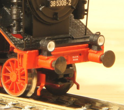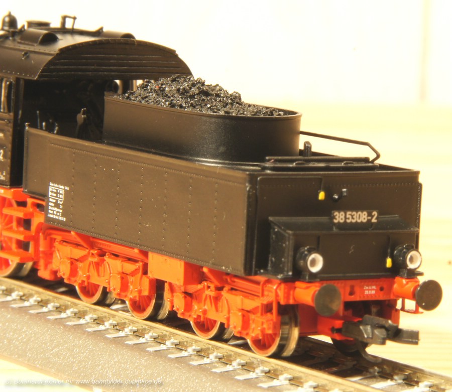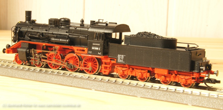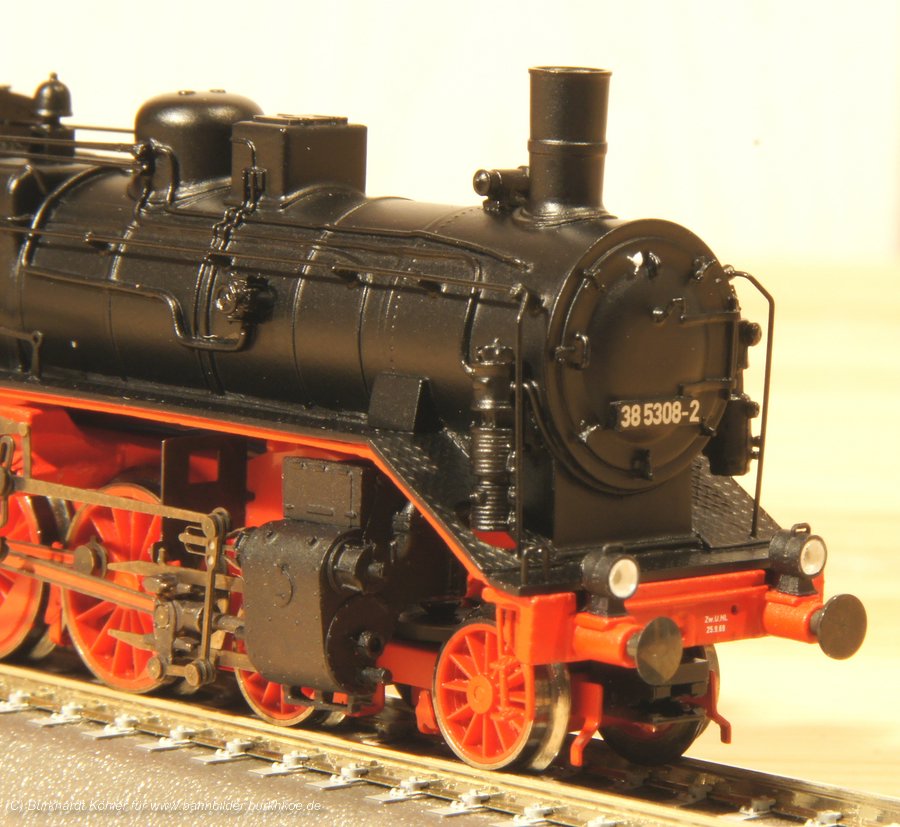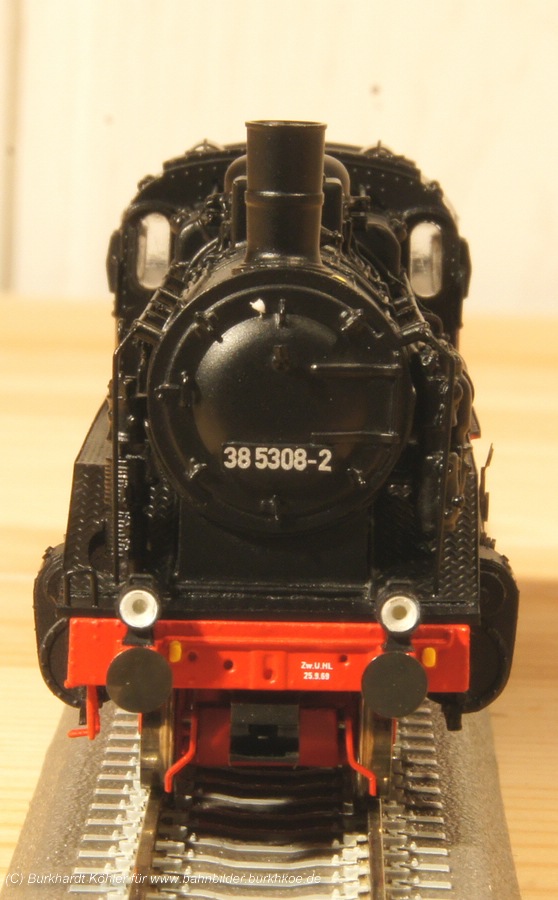 38 5308 besitzt auf der vorderen Pufferbohle und am Tender eine 2-Licht-Beleuchtung. Die Halterungen für das 3. Spitzenlicht sind an der Rauchkammertür und der Tenderrückwand freistehend nachgebildet. | ||