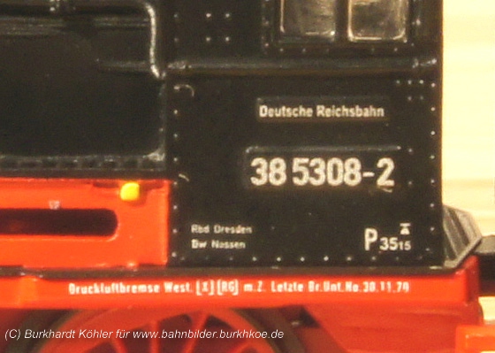 Zum Modell selbst: 38 5308-2 (ex 38 308, ex Sachs / Fabr.-Nr. 4504, Hartmann) Rbd Dresden BW Nossen letzte Bremsrevision 30.11.1970 |