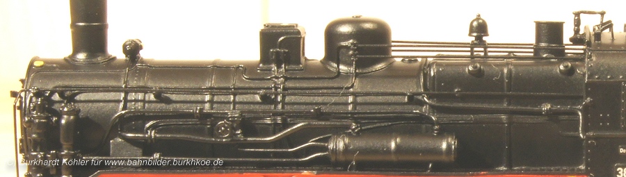Am Kessel der 38.2-3 finden sich eine Vielzahl freistehender und extra angesetzter Bauteile, die kritikfrei „feinstens“ ausgeformt und sauber ohne Klebespuren o.ä. verbaut wurden. Hier sei besonders auf das freistehende Speiseventil und die freistehende Halterung für das 3. Spitzenlicht an der Rauchkammertür hingewiesen. Alle Leitungen am Kessel sind mit minimal möglichem Durchmesser frei verlegt. „Schwimmhäute“ durch Formtrennkanten sucht man vergeblich. | ||