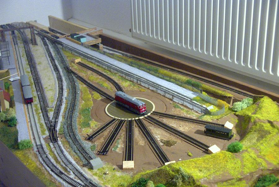 H0m-Drehscheibe mit Stahlblechabdeckung von PECO. Blick auf die Tfz-Abstellgleise imn Grenzbach.